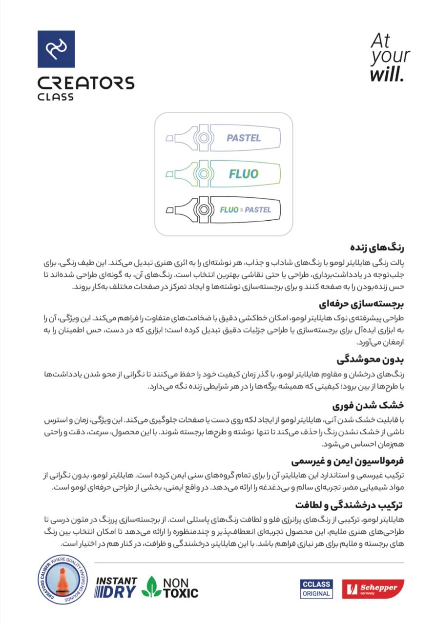 رنگهای درخشان و مقاوم هایلایتر لومو، با گذر زمان کیفیت خود را حفظ میکنند تا نگرانی از محو شدن یادداشتها یا طرحها از بین برود؛ کیفیتی که همیشه برگهها را در هر شرایطی زنده نگه میدارد.